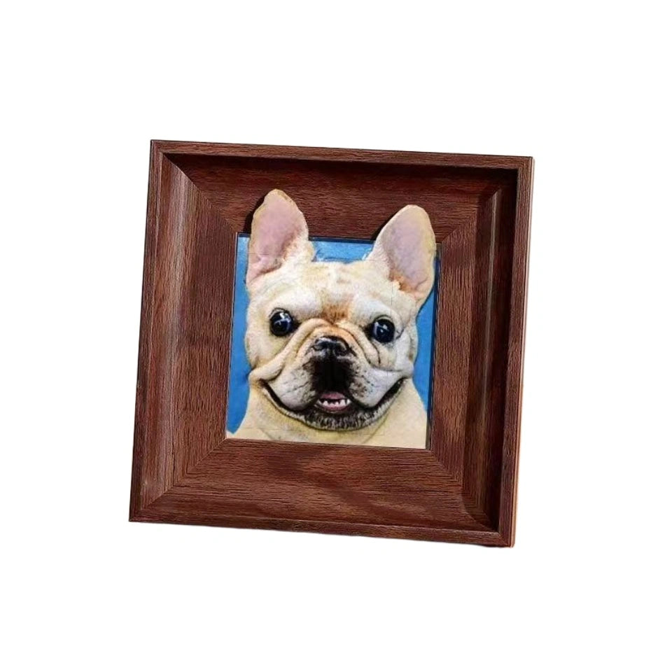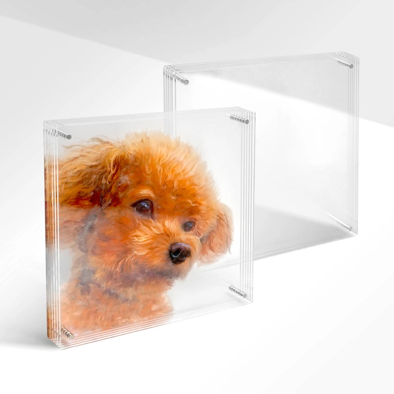 "Where photos transcend into sculpted dimensions. Your pet’s portrait is meticulously layered with laser-cut optical-grade acrylic, creating captivating depth through strategic shadow play. "